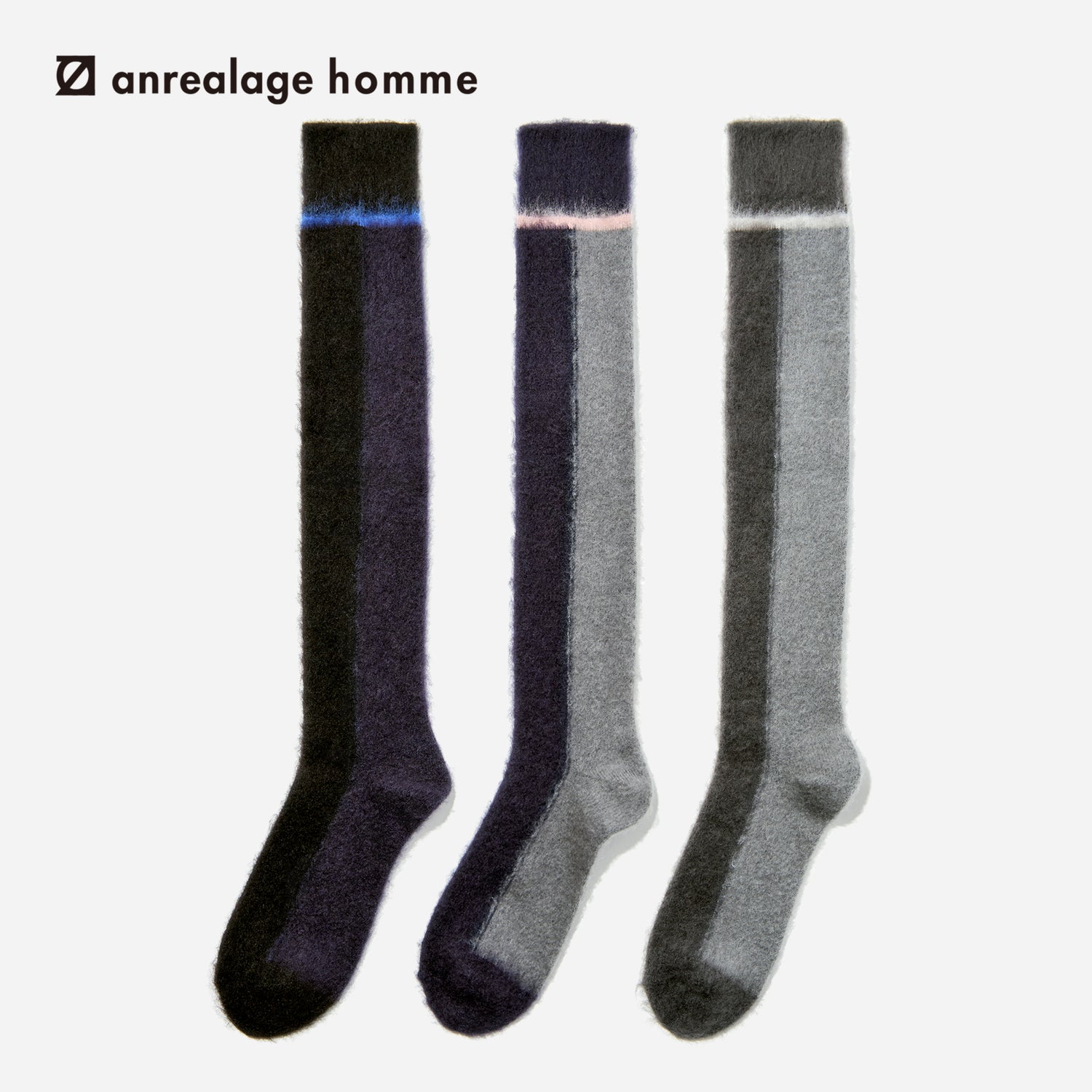 シックストックスの定番モデル「ライン」をベースに、前後で切り替えた配色がポイントのPATCHWORK MOHAIR SOCKS。