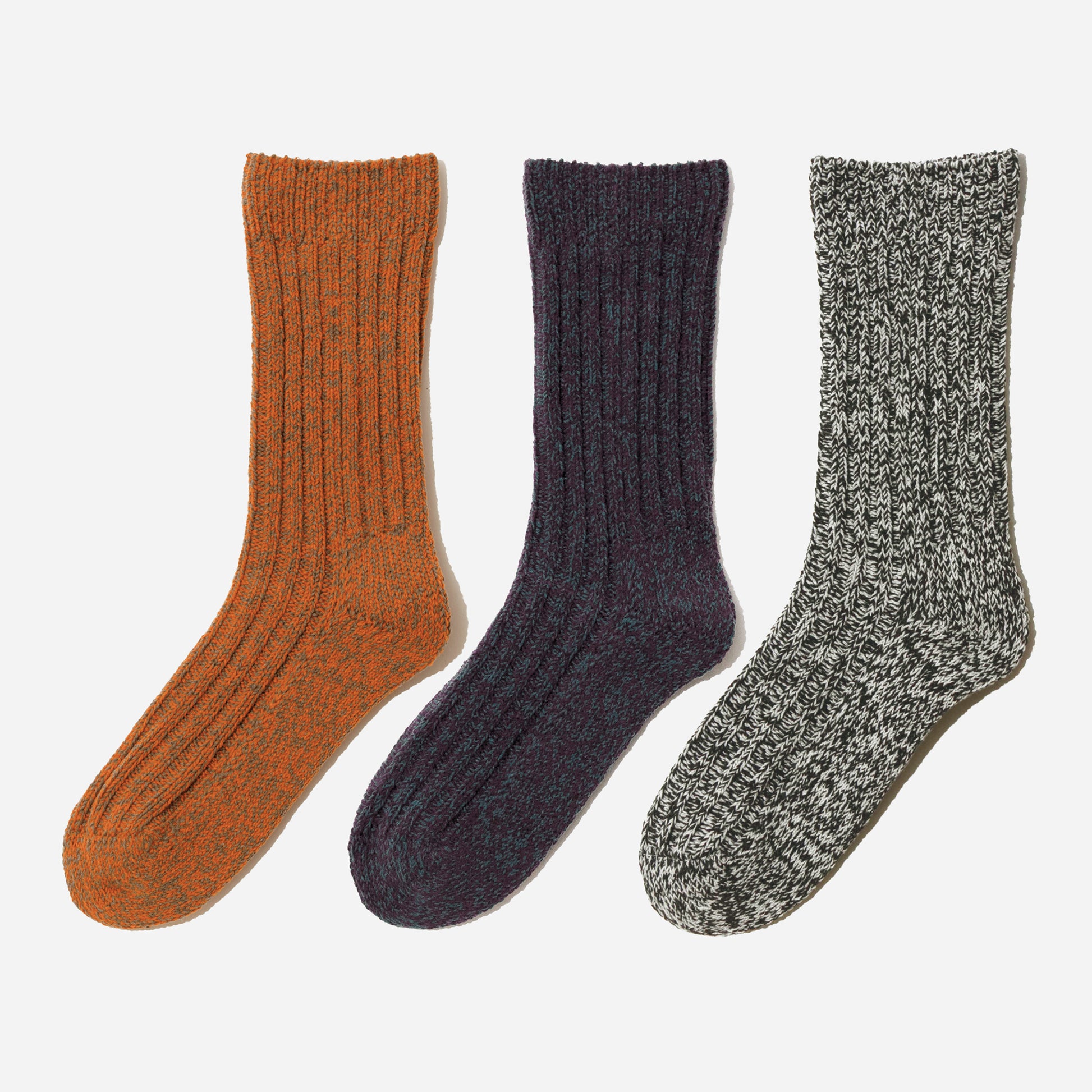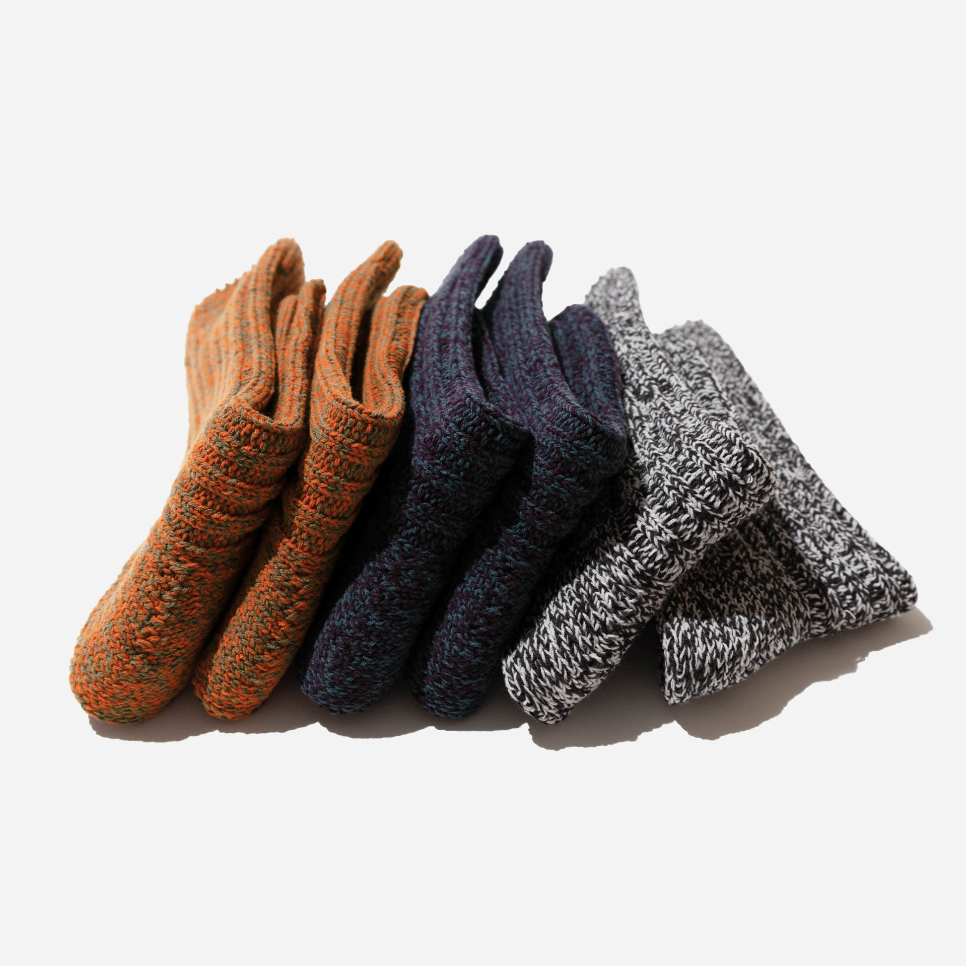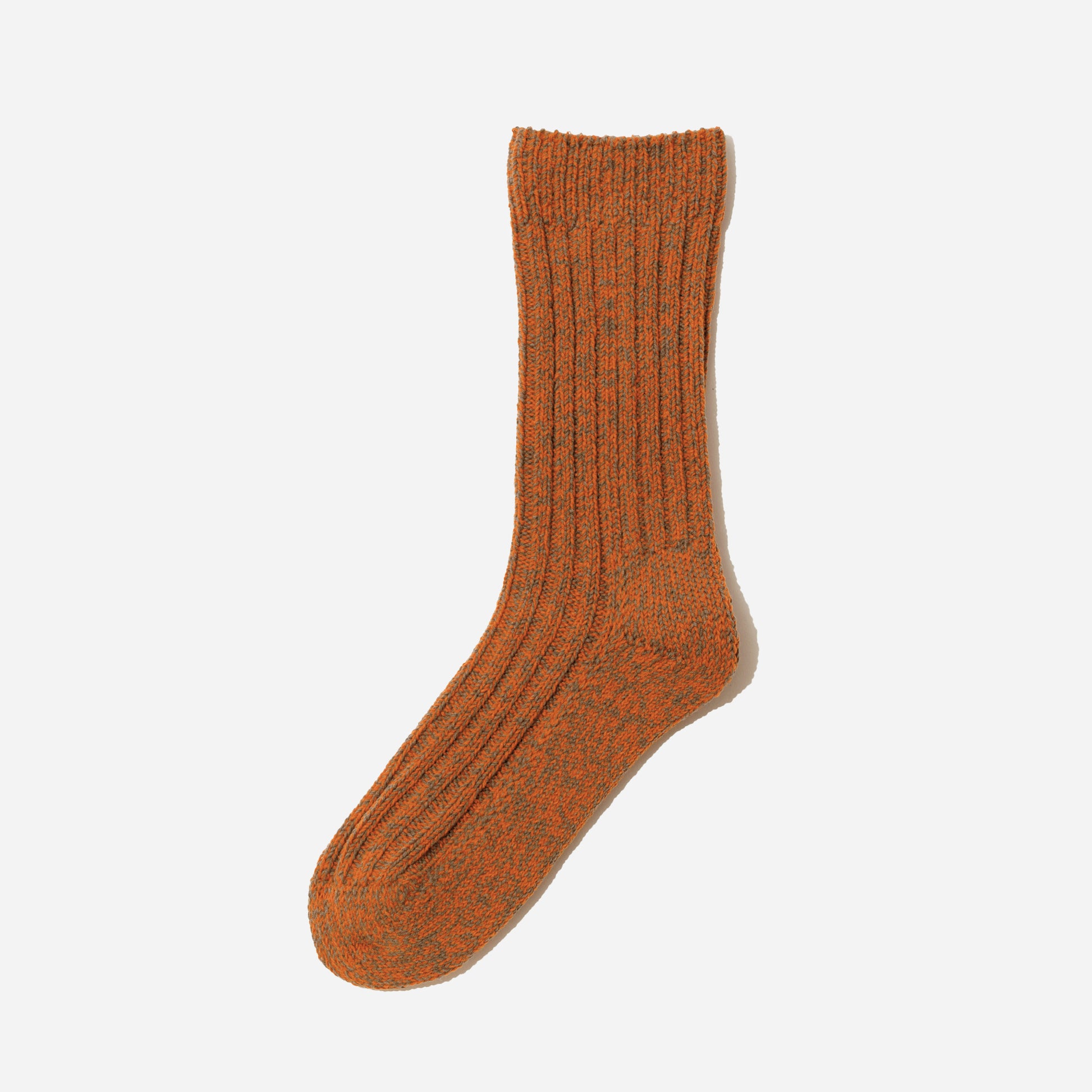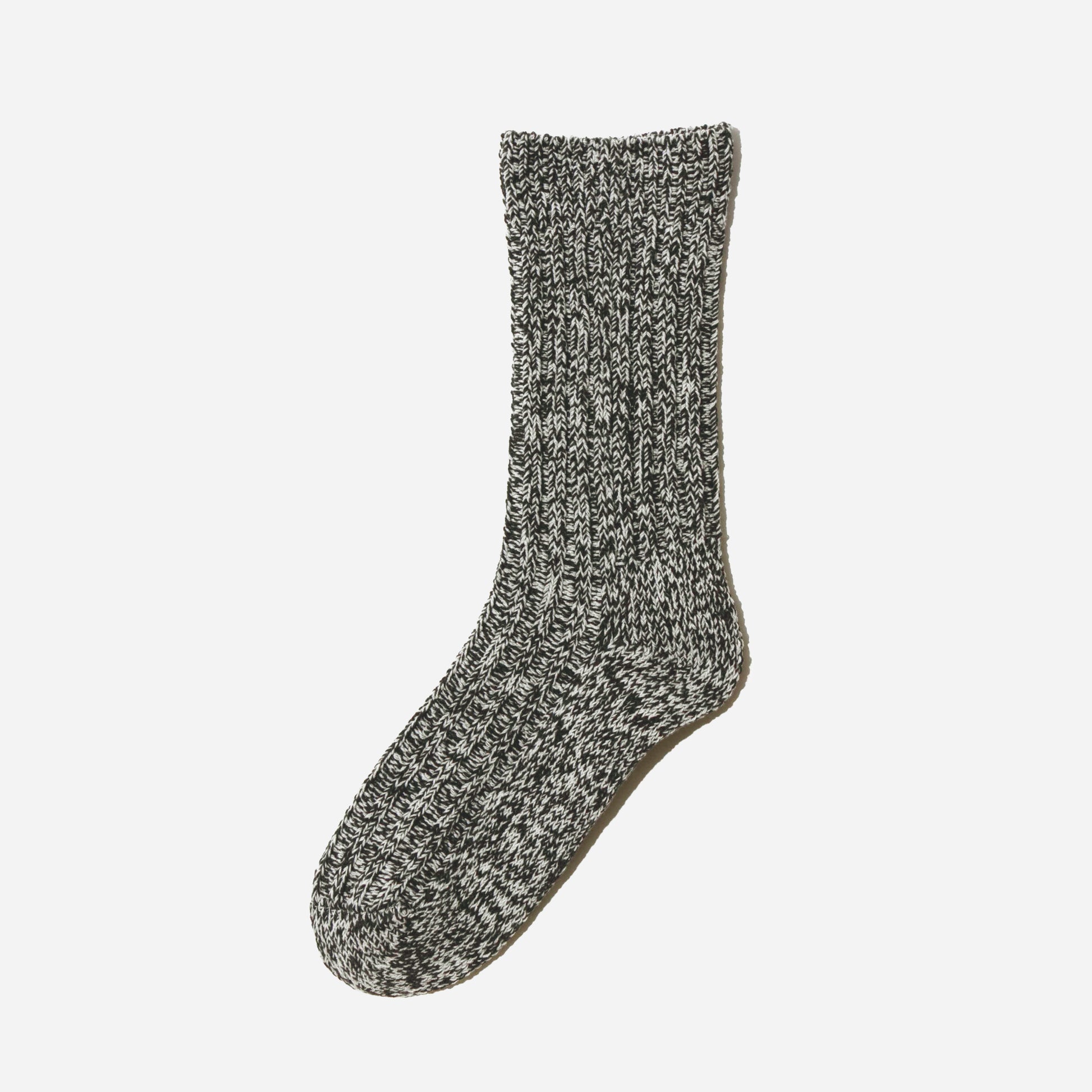 ざっくりとした風合いと、奥行きのある色合いが特徴のローゲージリブソックス。2色の太い糸を撚り合わせて作ったオリジナルの糸で編み上げました。立体的な表情を生む太糸リブで、装いにさりげない彩りを添えてくれます。