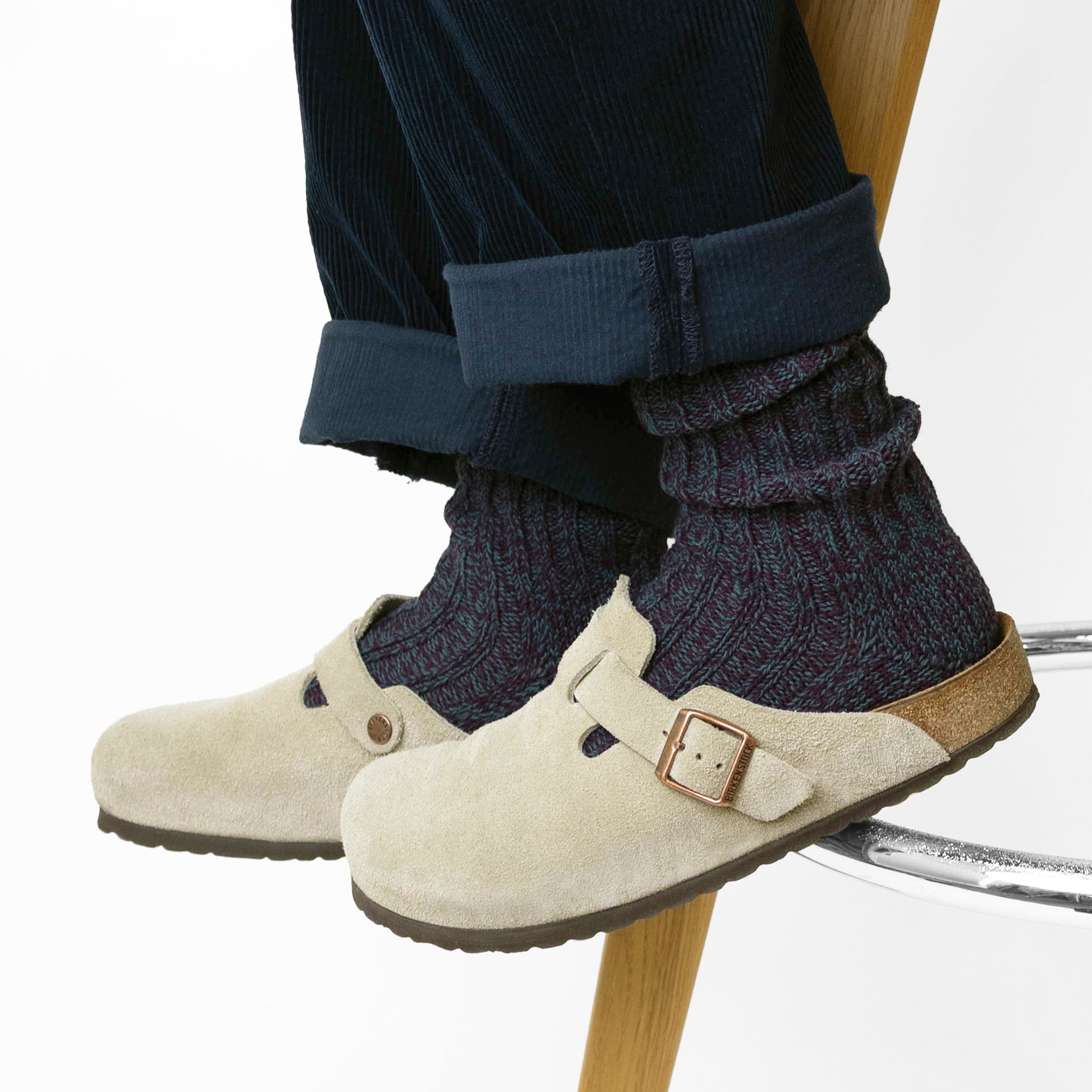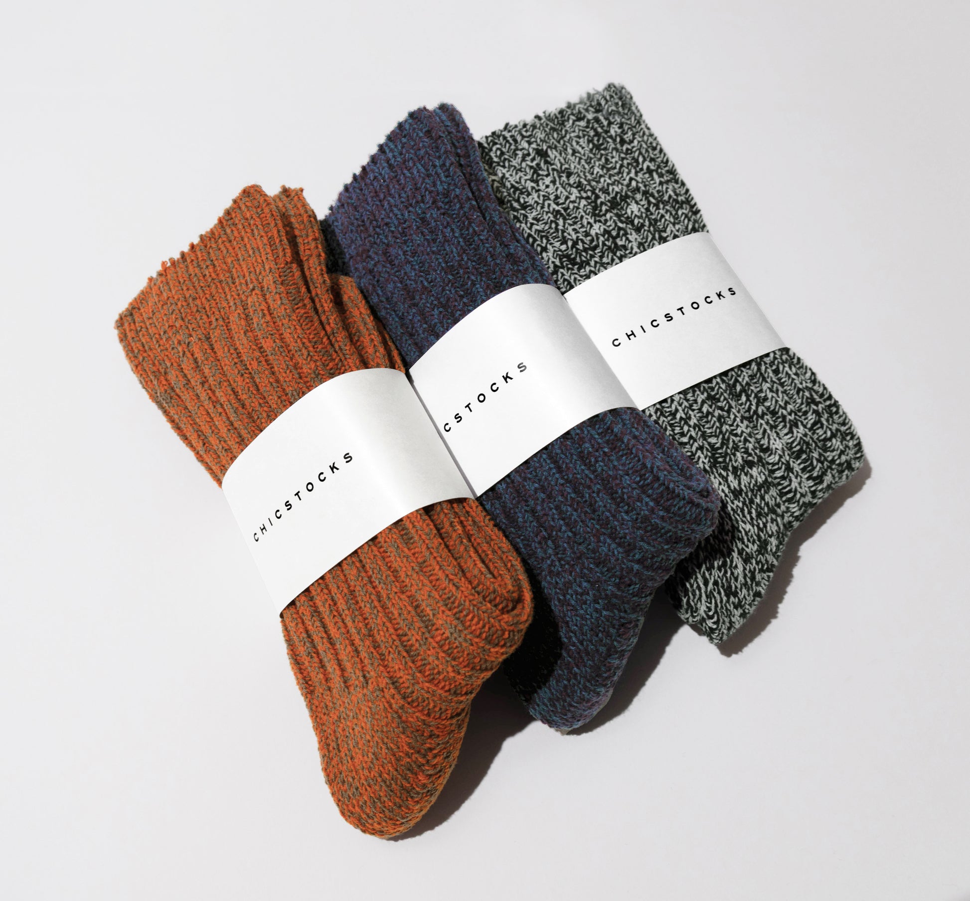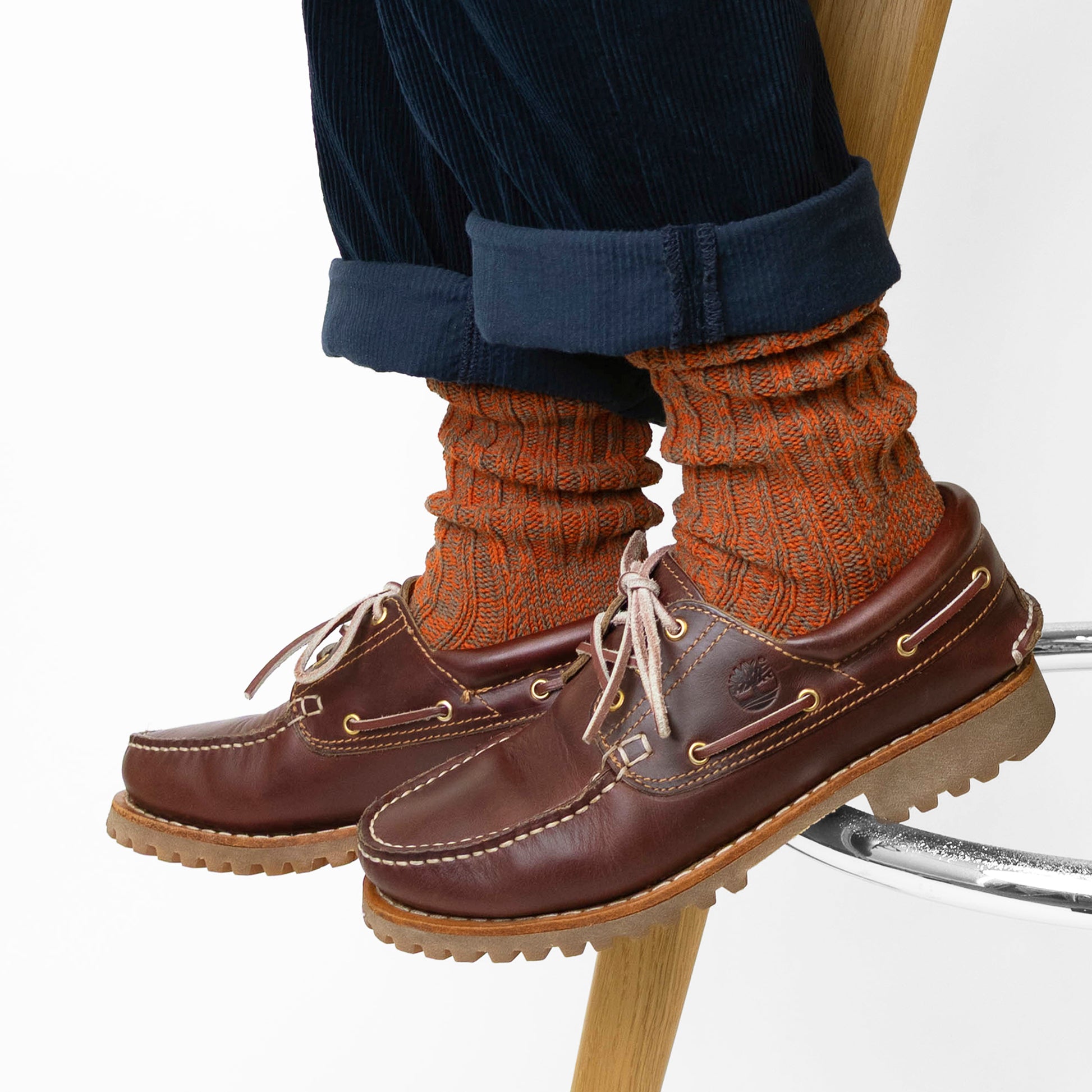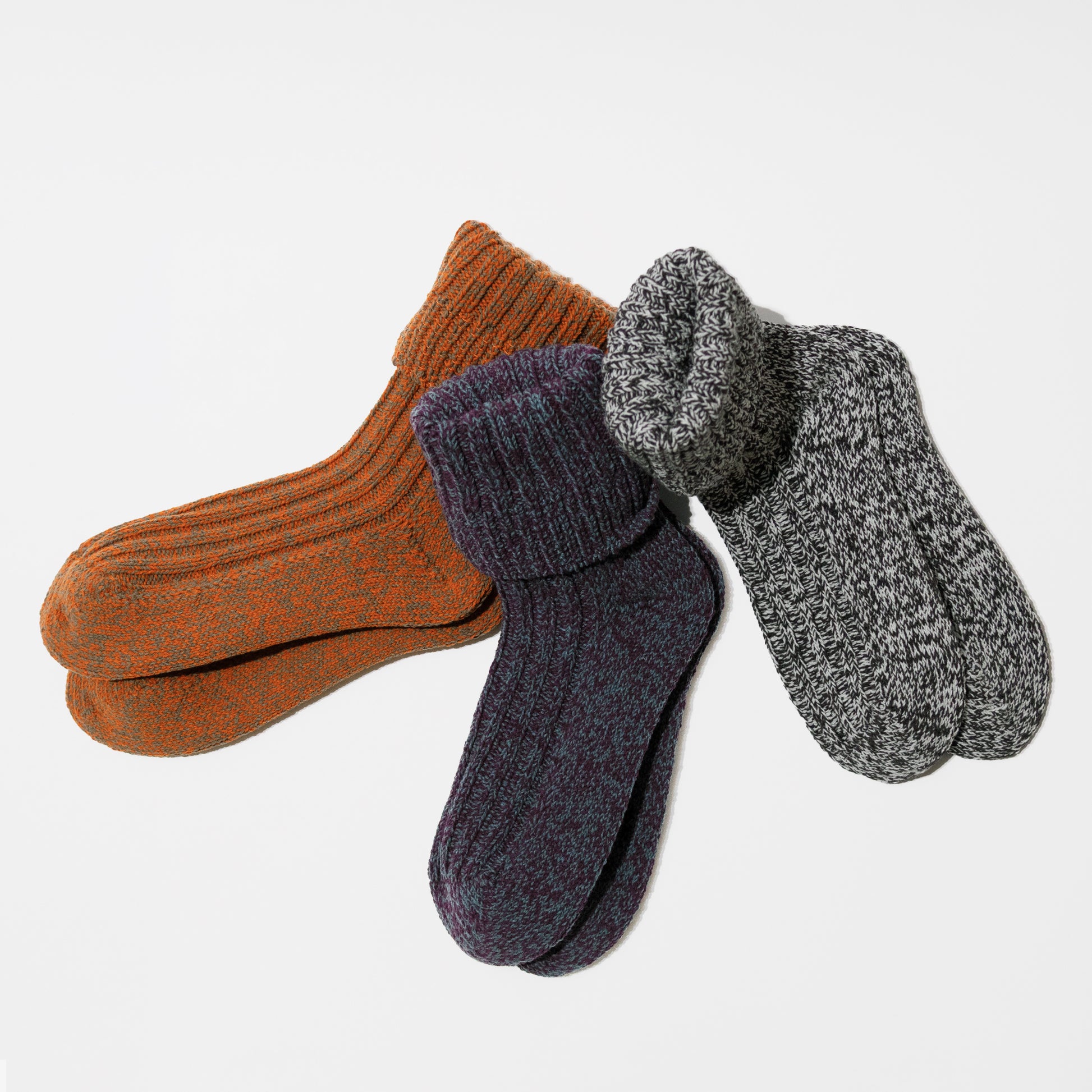 ざっくりとした風合いと、奥行きのある色合いが特徴のローゲージリブソックス。2色の太い糸を撚り合わせて作ったオリジナルの糸で編み上げました。立体的な表情を生む太糸リブで、装いにさりげない彩りを添えてくれます。