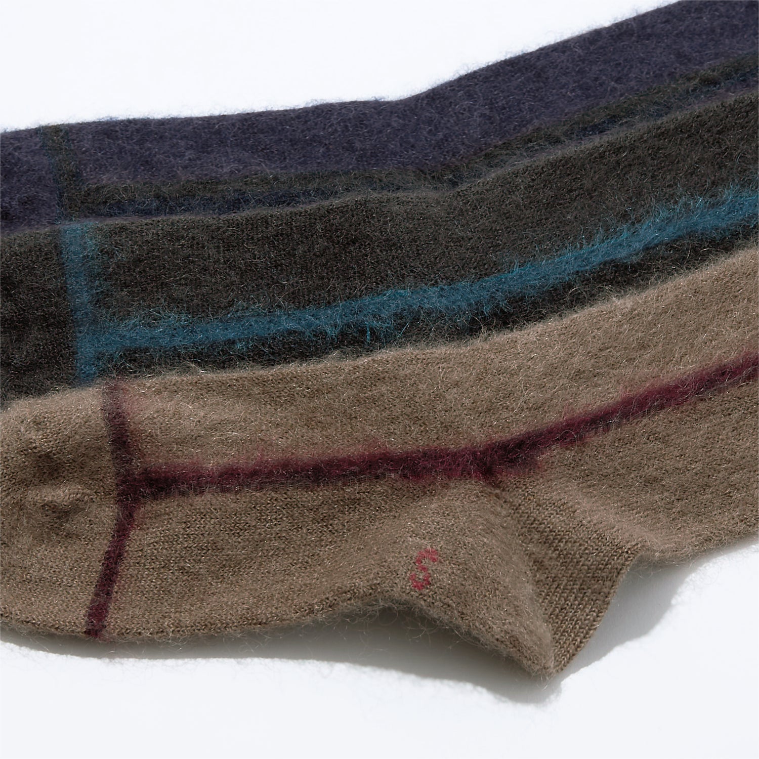 毛足の長いモヘヤで空気を多く含む為、高い保温力を発揮し肌寒い時期でも足元を温めます。モヘヤの雰囲気に合わせ、配色にもこだわりました。