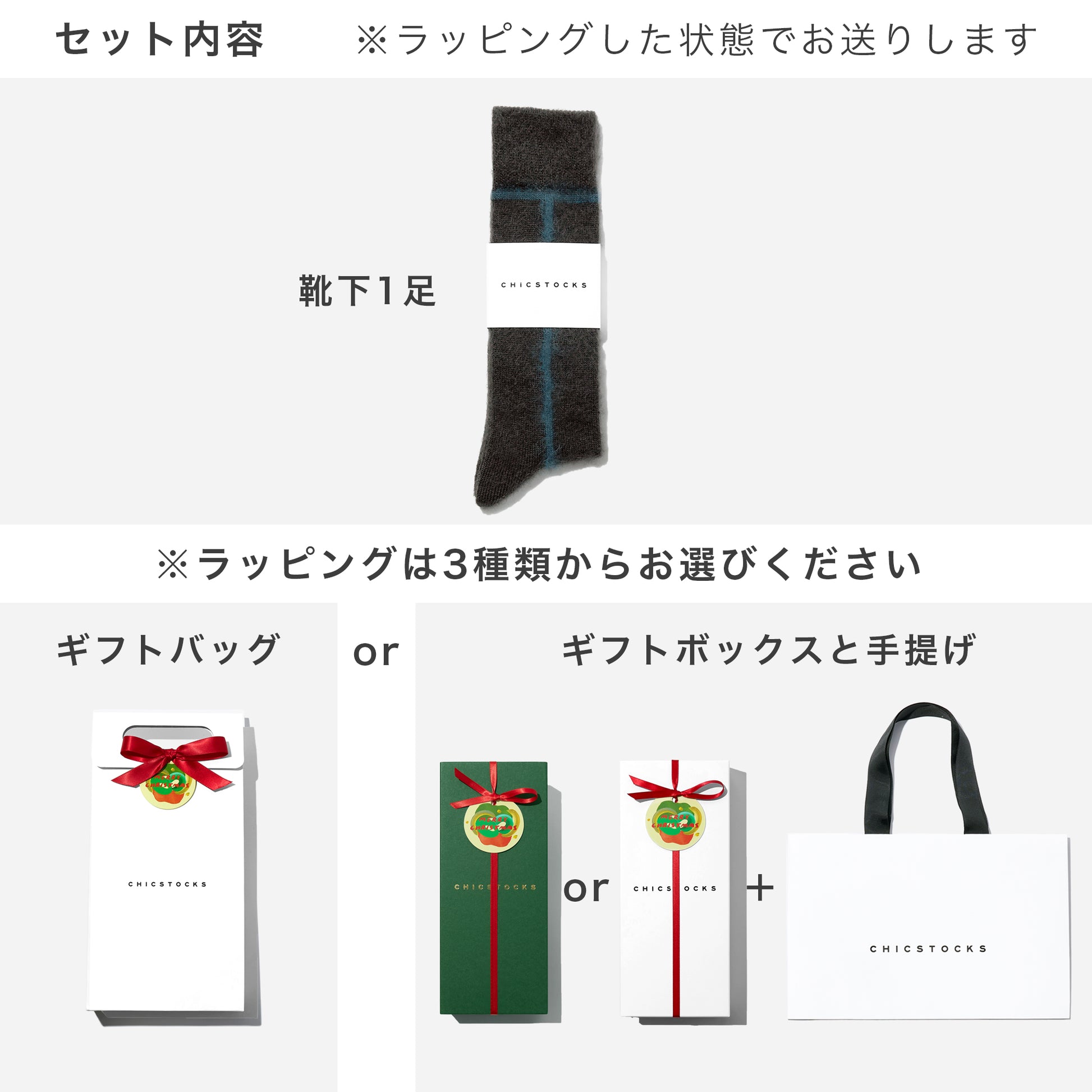 カジュアルに渡せる「ギフトバッグ」とフォーマルに渡せる「ギフトボックス(手提げ付き)」の2種類からお選びいただけます。靴下1足をラッピングした状態でお送りします。