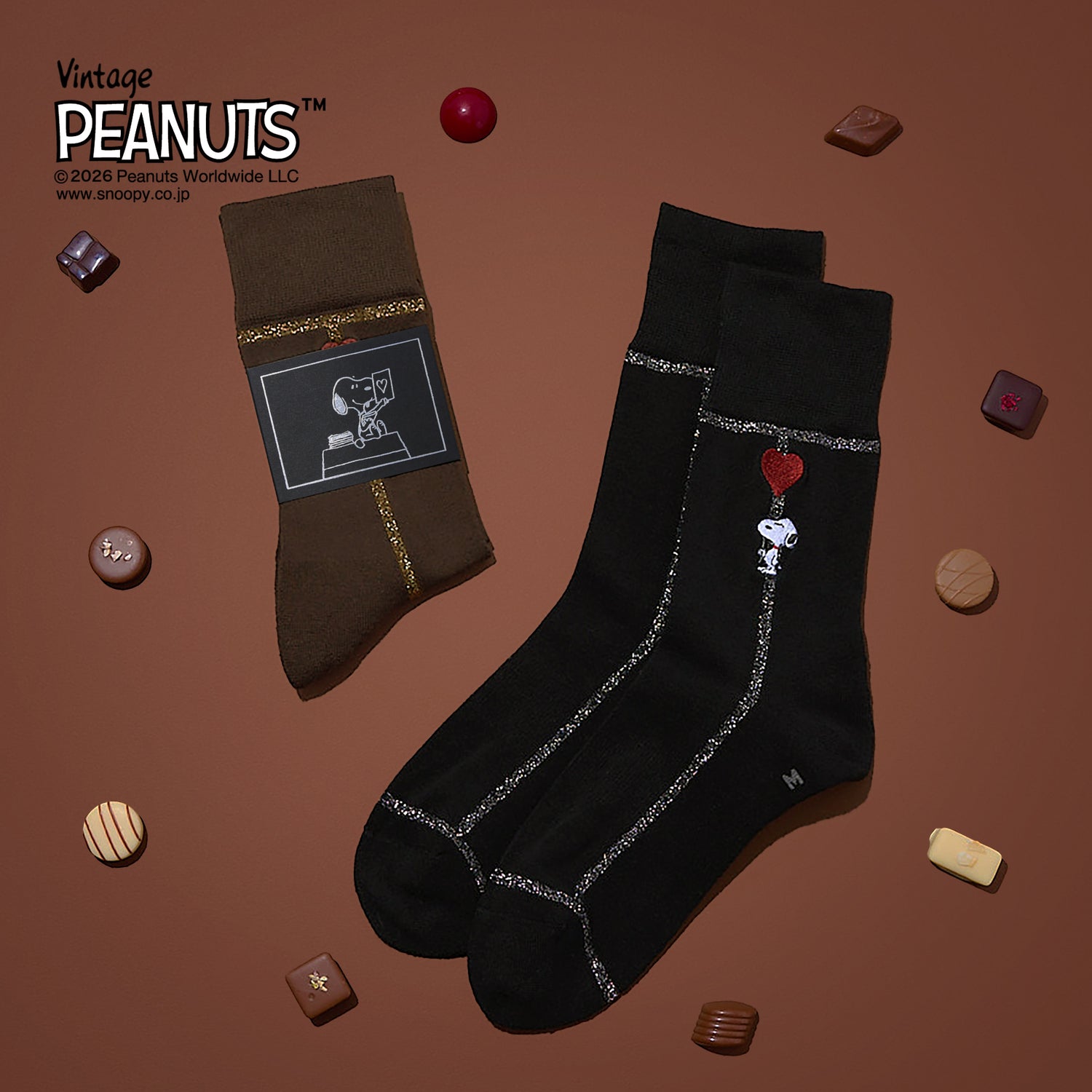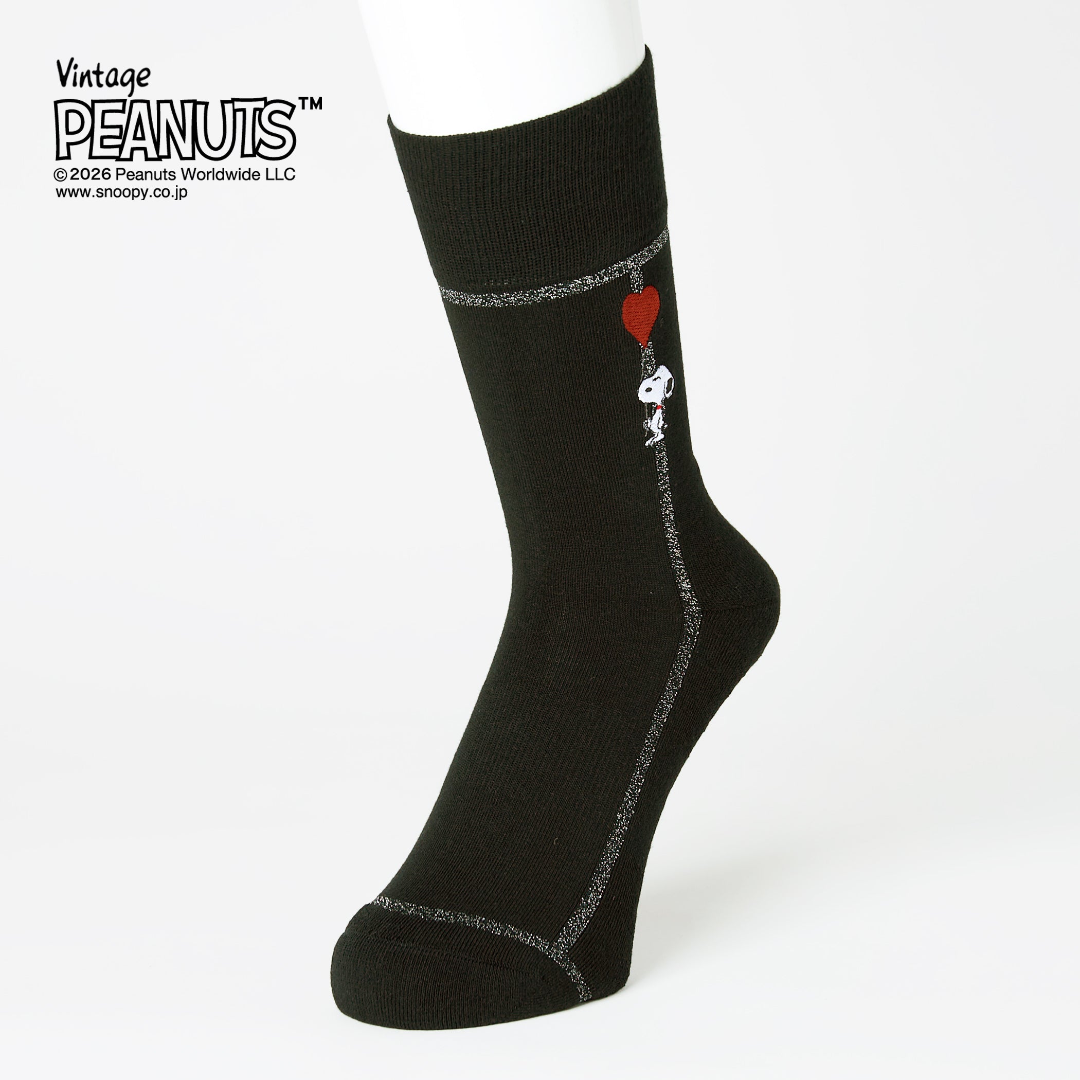 スヌーピーの刺繍やソックスを束ねる巻紙にハートをあしらった、バレンタインにおすすめのデザインです。
