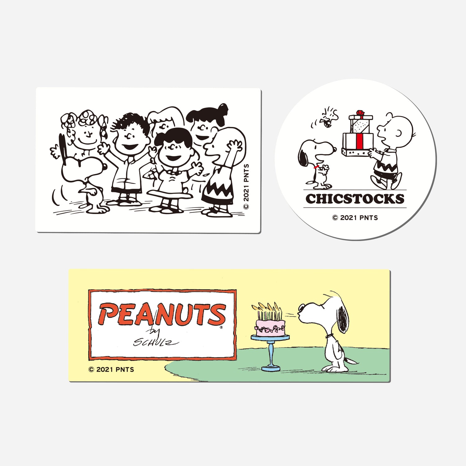 コミックで紹介されたスヌーピーの誕生日エピソードをモチーフにした、誕生日を連想させる3枚セットです。